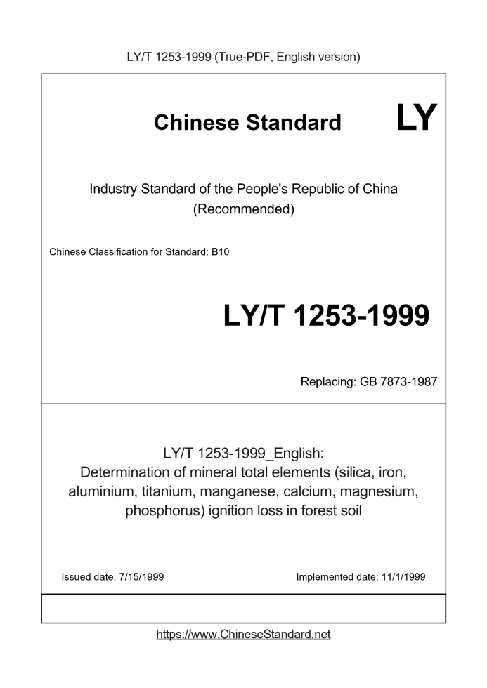 | LY/T 1253-1999 English PDFUS$699.00 ยท In stock Delivery: <= 4 days. True-PDF full-copy in English will be manually translated and delivered via email. LY/T 1253-1999: Determination of mineral total elements (silica, iron, aluminium, titanium, manganese, calcium, magnesium, phosphorus) ignition loss in forest soil