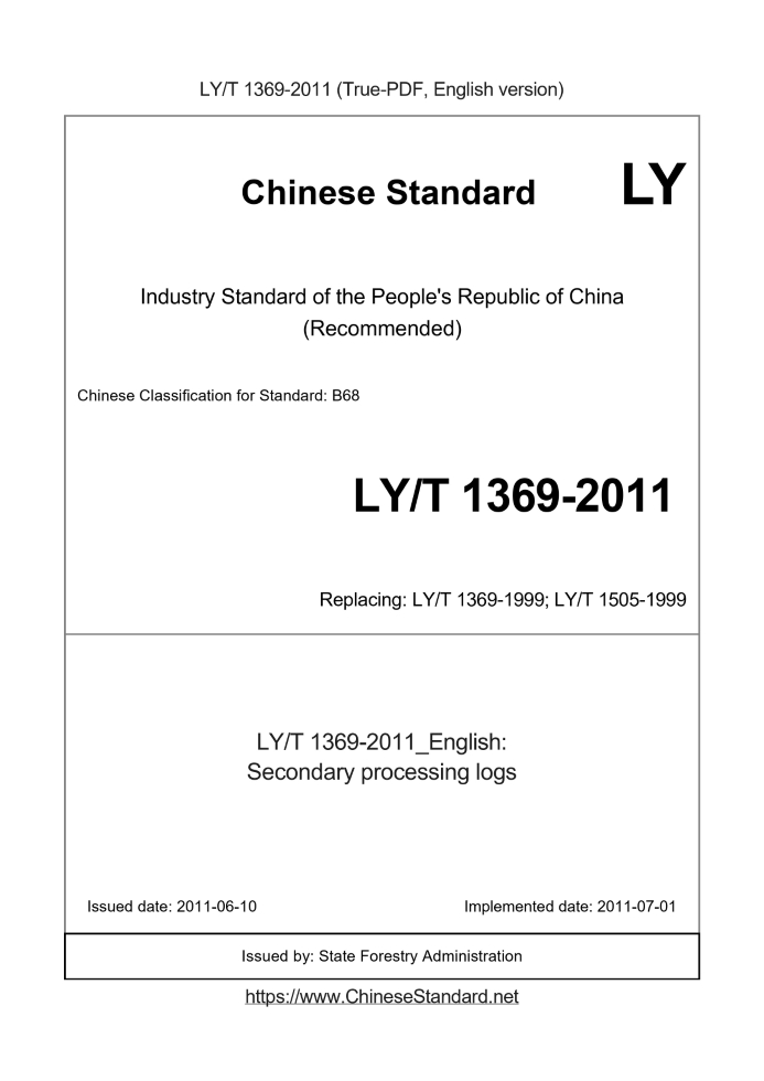 Delivery: <= 3 days. True-PDF full-copy in English will be manually translated and delivered via email. LY/T 1369-2011: Secondary processing logs Status: Valid LY/T 1369: Historical versions