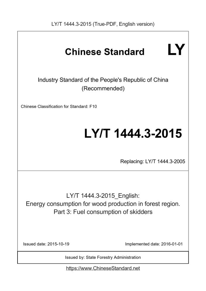 Basic dataStandard ID: LY/T 1444.3-2015 (LY/T1444.3-2015)Description (Translated English): Energy consumption for wood production in forest region. Part 3: Fuel consumption of skidders Sector / Industry: Forestry Industry Standard (Recommended) Classification of Chinese Standard: F10 Classification of International Standard: 65.020.99 Word Count Estimation: 10,183 Date of Issue: 2015-10-19 Date of Implementation: 2016-01-01 Older Standard (superseded by this standard): LY/T 1444.3-2005 Quoted Standard: GB/T 6422; GB 14192; GB/T 15316 Regulation (derived from): National Forestry Anministration Announcement ��2015 No.19�� Issuing agency(ies): State Forestry Administration Summary: This standard stipulates the basic fuel consumption, the correction coefficient, the calculation method and the actual fuel consumption of the skidding machine for the timber skidding in the forest area. The basic fuel consumption, the correction coefficient, the calculation method and the fuel consumption of the skidding machine of the SJ-23 cableway Of the calculation method. This standard applies to forest timber production tractors for the original article or log skidding, mountain small concentration of operations, the cable for wood skidding operations. LY/T 1444.3-2015: Energy consumption for wood production in forest region. Part 3: Fuel consumption of skidders---This is a DRAFT version for illustration, not a final translation. Full copy of true-PDF in English version (including equations, symbols, images, flow-chart, tables, and figures etc.) will be manually/carefully translated upon your order. Energy consumption for wood production in forest region. Part 3. Fuel consumption of skidders ICS 65.020.99 F10 People's Republic of China forestry industry standards Replaced LY/T 1444.3-2005 Forest timber production energy consumption Part 3. Skidding machinery fuel consumption Part 3. Fuelconsumptionofskidders Posted on.2015-10-19 2016-01-01 implementation State Forestry Administration released ForewordLY/T 1444 "Forest timber production energy consumption" is divided into 6 parts. --- Part 1. Comprehensive energy consumption; --- Part 2. Chain saw fuel consumption; --- Part 3. Skidding machinery fuel consumption; --- Part 4. Cutting area loading machinery fuel consumption; --- Part 5. Car transport fuel consumption; --- Part 6. Woodyard production energy consumption. This section is part 3 of LY/T 1444. This section drafted in accordance with GB/T 1.1-2009 given rules. This Part replaces LY/T 1444.3-2005 "Wood energy consumption in forestry production Part 3. Skidding machinery fuel consumption." This section The main changes compared with LY/T 1444.3-2005 are as follows. --- Increasing the normative references GB/T 6422, GB 14192 and GB/T 15316 (see Chapter 2); --- Deleted normative references LY/T 1444.2-2005 Forest timber production energy consumption Part 2. Chain saw fuel consumption (See Chapter 2 of the.2005 edition); --- Modify the scope of use (see Chapter 1,.2005 edition Chapter 1); --- Added the definition of correction factor (see 3.5); --- Removed the definition of temperature correction factor (see.2005 version 3.5); --- Removed the definition of altitude correction factor (see.2005 version 3.6); --- Removed the definition of cable work slope correction factor (see.2005 version 3.7); --- Removed the definition of tractor skid grade correction factor (see.2005 version 3.8); --- Removed the definition of forest grade correction factor (see.2005 version 3.9); --- Removed the definition of ropeway distance correction factor (see.2005 version 3.10); --- Removed the definition of tractor skid distance correction factor (see.2005 version 3.11); --- Increase the tractor model correction factor (see 4.2.8); --- Modify tractor skidding fuel consumption formula [see formula (2)]; --- Increasing the actual production of skidding machinery fuel consumption calculation method (see Chapter 5); --- Increase the actual production of skidding machinery fuel consumption testing and measurement requirements (see Chapter 6); --- Added information appendix A "various energy off standard coal coefficient" (see Appendix A). This part of the National Energy Foundation and Management Standardization Technical Committee forestry energy management sub-technical committee (SAC/TC20/SC7) Proposed and centralized. This section is responsible for drafting unit. Heilongjiang Institute of Forest Engineering and Environment. Participated in the drafting of this section. Jilin Province, Hongshi Forestry Bureau, Heilongjiang Academy of Forestry, Muling Forestry Bureau, Harbin Daqing Hotel. The main drafters of this section. Wang Xiu Bo, Zhang Hua, Zhao Shaosong, Xu Tan, Li Mingyuan, Junbo, Du Haiyan, Sun Licheng, Zhang Zhaohui. This part of the standard replaces the previous editions are. --- ZBB60001.3-1988, LY/T 1446-1999; --- LY 1001.3-1991; --- LY/T 1444.3-2005. Forest timber production energy consumption Part 3. Skidding machinery fuel consumption1 ScopeLY/T 1444 provisions of this part of the timber forest tractor production of wood or original timber, small mountain concentration, SJ-23 cableway (Ropeway) to carry out the basic fuel consumption of log skidding, correction factor, calculation method and the actual production of skid-mounted machinery fuel consumption Calculation method. This section applies to the production of wood in the forest area of the original tractor or log skidding, a small mountain work, ropeway for log skidding operation.2 Normative referencesThe following documents for the application of this document is essential. For dated references, only the dated version applies to this article Pieces. For undated references, the latest edition (including all amendments) applies to this document. GB/T 6422 energy-using equipment energy test guidelines General rules of timber harvesting and transportation GB/T 15316 energy-saving monitoring techniques3 Terms and definitionsGB 14192 and defined by the