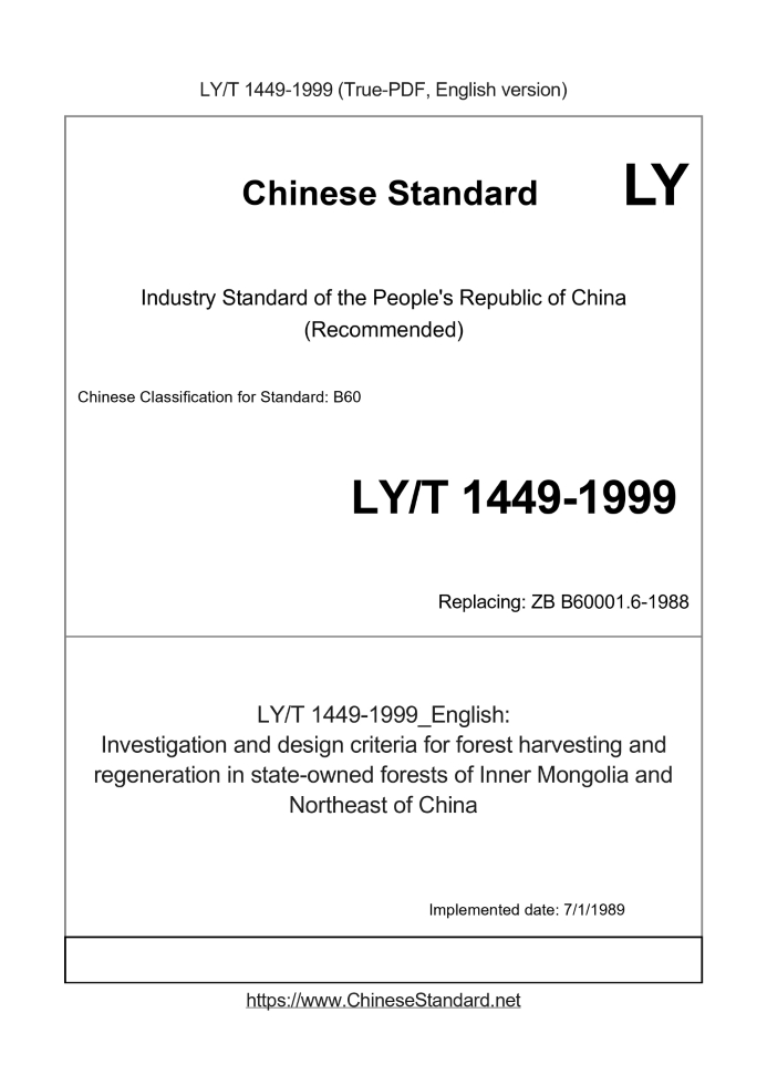 Delivery: <= 2 days. True-PDF full-copy in English will be manually translated and delivered via email. LY/T 1449-1999: Investigation and design criteria for forest harvesting and regeneration in state-owned forests of Inner Mongolia and Northeast of China Status: Obsolete