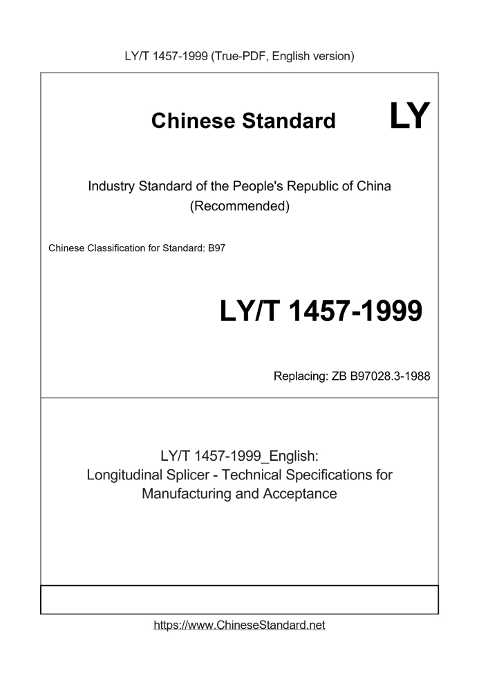 Basic dataStandard ID: LY/T 1457-1999 (LY/T1457-1999)Description (Translated English): Longitudinal Splicer - Technical Specifications for Manufacturing and Acceptance Sector / Industry: Forestry Industry Standard (Recommended) Classification of Chinese Standard: B97 Older Standard (superseded by this standard): ZB B97028.3-1988 Tips & Frequently Asked Questions:Question 1: How long will the true-PDF of LY/T 1457-1999_English be delivered?Answer: Upon your order, we will start to translate LY/T 1457-1999_English as soon as possible, and keep you informed of the progress. The lead time is typically 1 ~ 3 working days. The lengthier the document the longer the lead time.Question 2: Can I share the purchased PDF of LY/T 1457-1999_English with my colleagues?Answer: Yes. The purchased PDF of LY/T 1457-1999_English will be deemed to be sold to your employer/organization who actually pays for it, including your colleagues and your employer's intranet.Question 3: Does the price include tax/VAT?Answer: Yes. Our tax invoice, downloaded/delivered in 9 seconds, includes all tax/VAT and complies with 100+ countries' tax regulations (tax exempted in 100+ countries) -- See Avoidance of Double Taxation Agreements (DTAs): List of DTAs signed between Singapore and 100+ countriesQuestion 4: Do you accept my currency other than USD?Answer: Yes. If you need your currency to be printed on the invoice, please write an email to Sales@ChineseStandard.net. In 2 working-hours, we will create a special link for you to pay in any currencies. Otherwise, follow the normal steps: Add to Cart -- Checkout -- Select your currency to pay. |