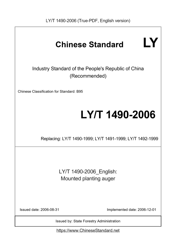 Delivery: <= 3 days. True-PDF full-copy in English will be manually translated and delivered via email. LY/T 1490-2006: Mounted planting auger Status: Valid LY/T 1490: Historical versions