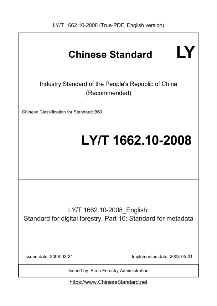 Delivery: <= 4 days. True-PDF full-copy in English will be manually translated and delivered via email. LY/T 1662.10-2008: Standard for digital forestry. Part 10: Standard for metadata Status: Valid