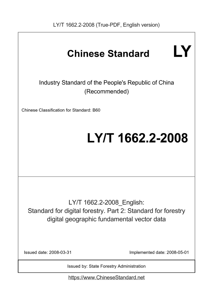 Delivery: <= 3 days. True-PDF full-copy in English will be manually translated and delivered via email. LY/T 1662.2-2008: Standard for digital forestry. Part 2: Standard for forestry digital geographic fundamental vector data Status: Valid