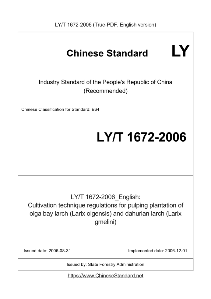 Delivery: <= 3 days. True-PDF full-copy in English will be manually translated and delivered via email. LY/T 1672-2006: Cultivation technique regulations for pulping plantation of olga bay larch (Larix olgensis) and dahurian larch (Larix gmelini)
