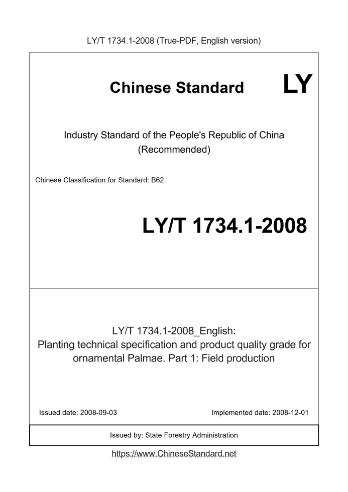 Delivery: <= 3 days. True-PDF full-copy in English will be manually translated and delivered via email. LY/T 1734.1-2008: Planting technical specification and product quality grade for ornamental Palmae. Part 1: Field production LY/T 1734.1: Historical versions