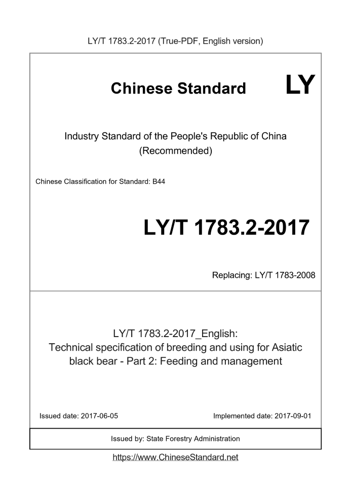 Delivery: <= 3 days. True-PDF full-copy in English will be manually translated and delivered via email. LY/T 1783.2-2017: Technical specification of breeding and using for Asiatic black bear - Part 2: Feeding and management Status: Valid