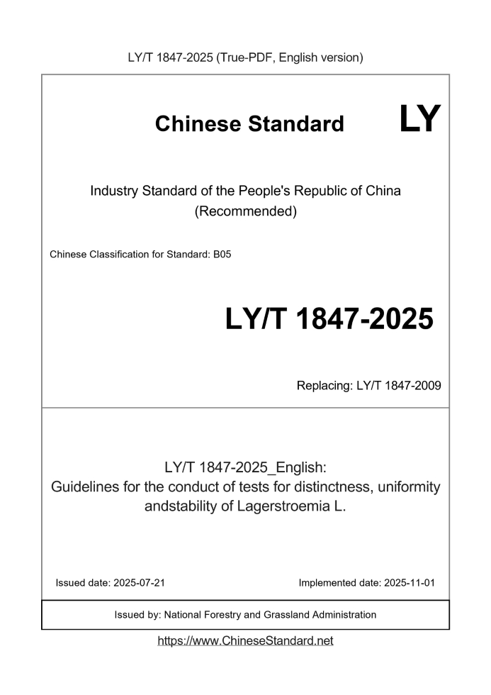 Basic dataStandard ID: LY/T 1847-2025 (LY/T1847-2025)Description (Translated English): Guidelines for the conduct of tests for distinctness, uniformity andstability of Lagerstroemia L. Sector / Industry: Forestry Industry Standard (Recommended) Classification of Chinese Standard: B05 Classification of International Standard: 65.020.20 Date of Issue: 2025-07-21 Date of Implementation: 2025-11-01 Older Standard (superseded by this standard): LY/T 1847-2009 Issuing agency(ies): National Forestry and Grassland Administration LY/T 1847-2009: Guidelines for the conduct of tests for distinctness, uniformity and stability. Crapemytle(Lagerstroemia indica L.)---This is a DRAFT version for illustration, not a final translation. Full copy of true-PDF in English version (including equations, symbols, images, flow-chart, tables, and figures etc.) will be manually/carefully translated upon your order. Guidelines for the conduct of tests for distinctness, uniformity and stability.Crapemytle(Lagerstroemia indica L.) ICS 65.020 B61 People's Republic of China Forestry Industry Standard New plant variety specificity, consistency, stability Test Guide Ziwei Released on June 17,.2009 2009-10-01 implementation State Forestry Administration released ContentForeword III 1 Scope 1 2 Normative references 1 3 Terms and Definitions 1 4 DUS test technical requirements 1 4.1 Test material 1 4.2 Test Method 1 5 Specificity, consistency and stability evaluation 2 5.1 specificity 2 5.2 Consistency 3 5.3 Stability 3 6 variety group 3 6.1 Variety group description 3 6.2 Grouping Features 3 7 trait characteristics and related symbol description 3 7.1 Feature Type 3 7.2 Expression status and code 3 7.3 Expression Type 3 7.4 Standard Variety 3 7.5 Symbol Description 3 Appendix A (Normative Appendix) Variety traits characteristics 5 Appendix B (informative) Technical Questionnaire 11 Reference 13ForewordThis standard is based on GB/T 19557.1-2004 "General guidelines for the specificity, consistency and stability of new plant varieties". Appendix A of this standard is a normative appendix, and Appendix B is an informative appendix. This standard is proposed and managed by the Office of Plant Variety Protection of the State Forestry Administration. This standard is drafted by. Beijing Forestry University, State Forestry Administration Plant New Variety Protection Office. The main drafters of this standard. Zhang Qixiang, Zhou Jianren, Huang Faji, Gao Yizhen, Pan Huitang, Tian Miao. New plant variety specificity, consistency, stability Test Guide Ziwei1 ScopeTest technical requirements. This standard applies to the testing of all new varieties of Lagerstroemia.2 Normative referencesThe terms in the following documents become the terms of this standard by reference to this standard. All dated references, followed by all Modifications (not including errata content) or revisions do not apply to this standard, however, parties to agreements based on this standard are encouraged to study Is it possible to use the latest version of these files? For undated references, the latest edition applies to this standard. GB/T 19557.1-2004 General guidelines for the testing of plant species specificity, consistency and stability3 Terms and definitionsThe terms and definitions established in GB/T 19557.1-2004 apply to this standard.4 DUS test technical requirements4.1 Test materials 4.1.1 The time and place of the test variety delivered by the approval authority and the quantity and quality of the plant material required for testing. Non-tested For materials submitted by the state or region, the applicant shall provide relevant documents such as customs and phytosanitary in accordance with the relevant provisions on entry and exit and transportation. 4.1.2 The test material submitted should be a 2-year-old plant that is propagated by cuttings. 4.1.3 The number of test materials provided shall not be less than 10 strains. 4.1.4 The new variety of materials to be tested shall be plants that are free of pests and diseases and grow normally. 4.1.5 Except where the approval authority permits or requires the treatment of the material, the submitted plant material shall not be subject to any amount of trait expression. External processing. If it has been processed, detailed information about the processing should be provided. 4.2 Test methods 4.2.1 Test cycle and time Test at least one growth cycle if the test conditions are met. 4.2.2 Test location The test site for the new variety to be tested shall be carried out in the test base and laboratory designated by the approval authority. 4.2.3 Test conditions The test shall be carried out under the condition that the relevant characteristics of the new variety to be tested can be fully expressed, and the selected test materials shall be at least at the test site. The site is fixed for more than one year. 4.2.4 Test Design 4.2.4.1 New varieties to be tested 10 plants should be planted in the test area, planted in the same location and environmental conditions as standard and similar varieties. 4.2.4.2 If the test requires extraction of certain parts of the plant as a sample, the sample collection shall not affect the entire growth cycle of the test plant. Observation. 4.2.4.3 Unless otherwise stated, all observations shall be made on materials on the same part of 6 plants or 6 plants. ......Tips & Frequently Asked Questions:Question 1: How long will the true-PDF of LY/T 1847-2025_English be delivered?Answer: Upon your order, we will start to translate LY/T 1847-2025_English as soon as possible, and keep you informed of the progress. The lead time is typically 1 ~ 3 working days. The lengthier the document the longer the lead time.Question 2: Can I share the purchased PDF of LY/T 1847-2025_English with my colleagues?Answer: Yes. The purchased PDF of LY/T 1847-2025_English will be deemed to be sold to your employer/organization who actually pays for it, including your colleagues and your employer's intranet.