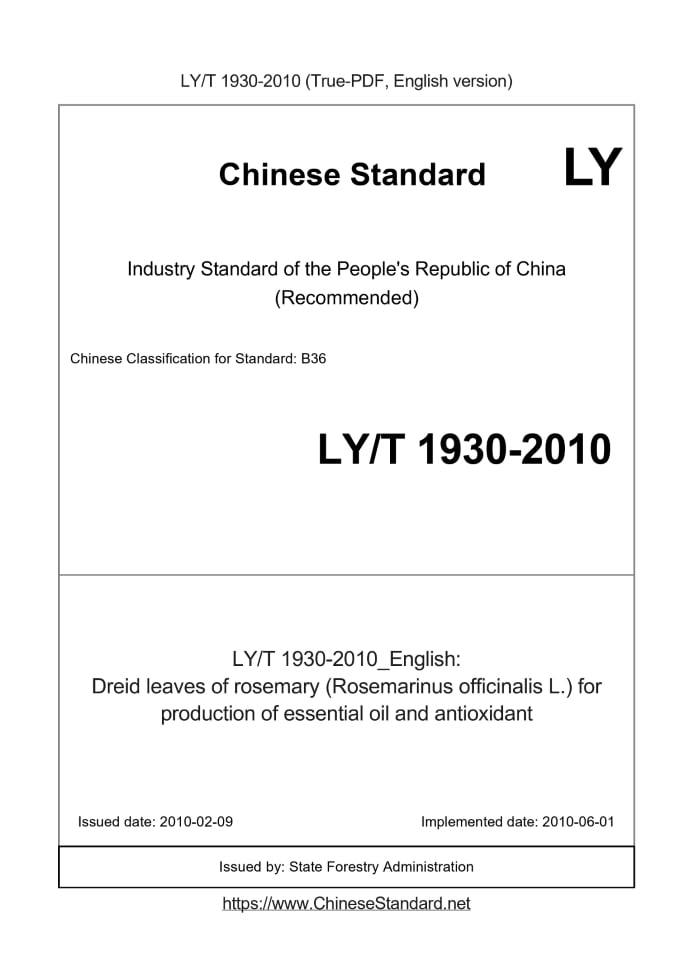 Delivery: <= 3 days. True-PDF full-copy in English will be manually translated and delivered via email. LY/T 1930-2010: Dreid leaves of rosemary (Rosemarinus officinalis L.) for production of essential oil and antioxidant