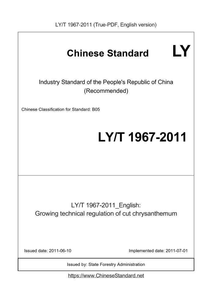 Delivery: <= 3 days. True-PDF full-copy in English will be manually translated and delivered via email. LY/T 1967-2011: Growing technical regulation of cut chrysanthemum Status: Valid