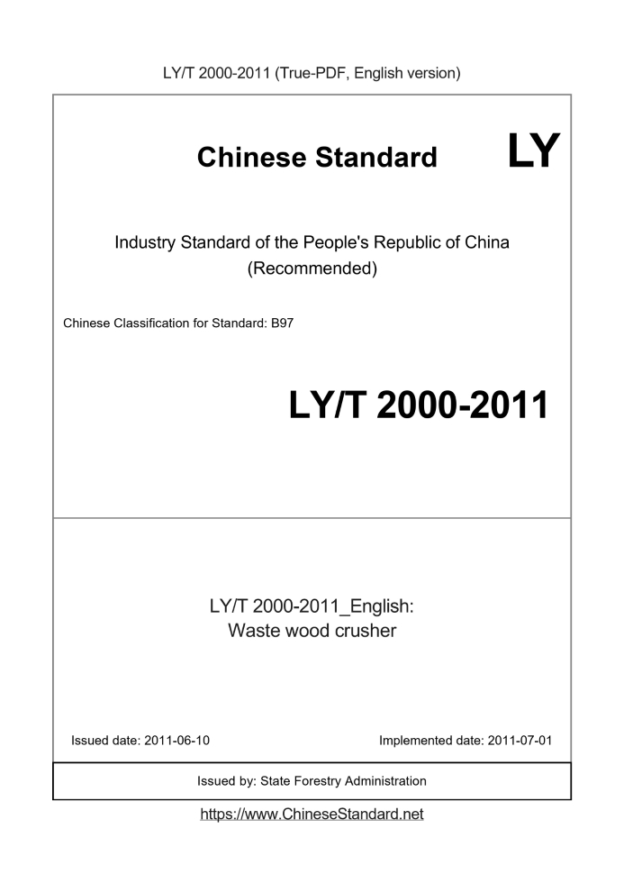 Delivery: <= 3 days. True-PDF full-copy in English will be manually translated and delivered via email. LY/T 2000-2011: Waste wood crusher Status: Valid