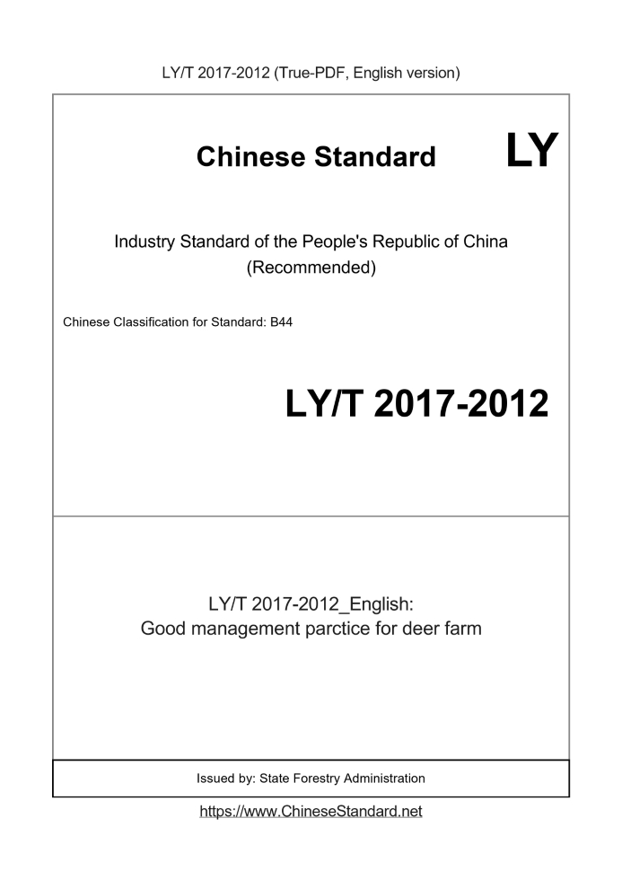 Delivery: <= 7 days. True-PDF full-copy in English will be manually translated and delivered via email. LY/T 2017-2012: Good management parctice for deer farm Status: Valid