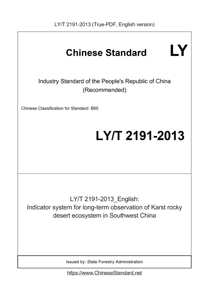Delivery: <= 3 days. True-PDF full-copy in English will be manually translated and delivered via email. LY/T 2191-2013: Indicator system for long-term observation of Karst rocky desert ecosystem in Southwest China Status: Valid