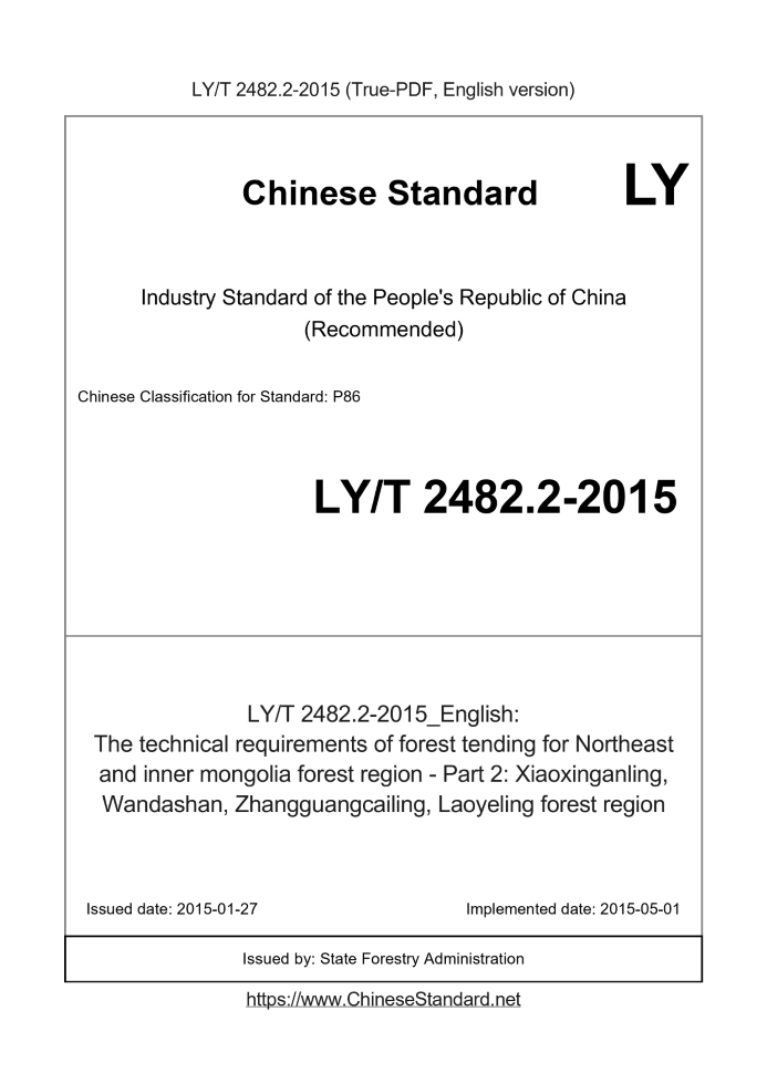Delivery: <= 4 days. True-PDF full-copy in English will be manually translated and delivered via email. LY/T 2482.2-2015: The technical requirements of forest tending for Northeast and inner mongolia forest region - Part 2: Xiaoxinganling, Wandashan, Zhangguangcailing, Laoyeling forest region Status: Valid