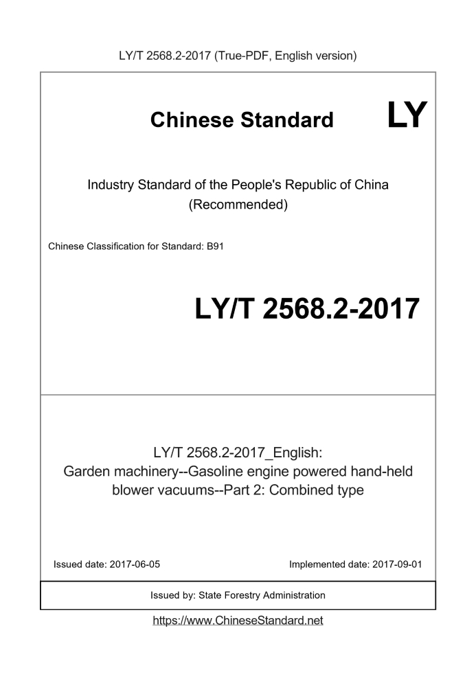 Delivery: <= 3 days. True-PDF full-copy in English will be manually translated and delivered via email. LY/T 2568.2-2017: Garden machinery--Gasoline engine powered hand-held blower vacuums--Part 2: Combined type Status: Valid