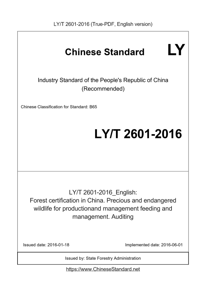 Delivery: <= 5 days. True-PDF full-copy in English will be manually translated and delivered via email. LY/T 2601-2016: Forest certification in China. Precious and endangered wildlife for productionand management feeding and management. Auditing Status: Valid