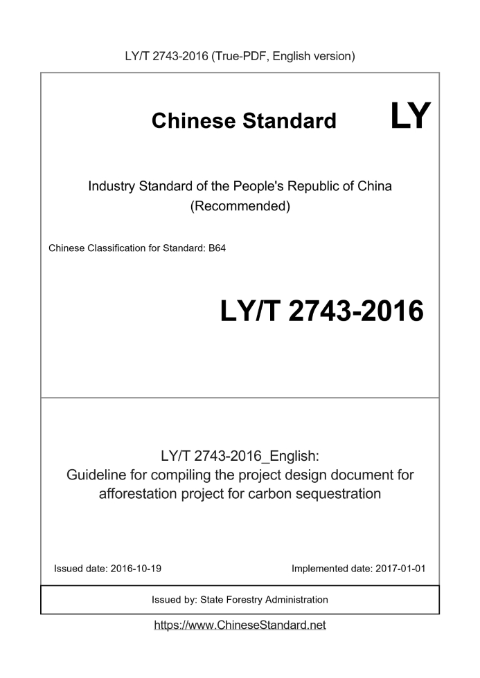 Delivery: <= 3 days. True-PDF full-copy in English will be manually translated and delivered via email. LY/T 2743-2016: Guideline for compiling the project design document for afforestation project for carbon sequestration Status: Valid