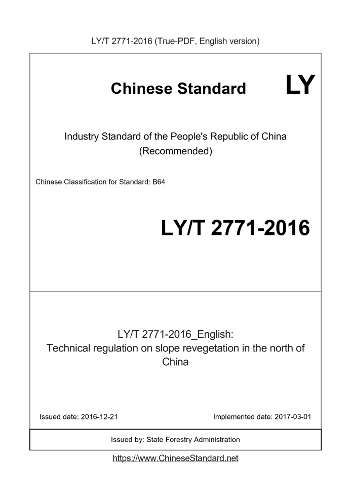 Delivery: <= 5 days. True-PDF full-copy in English will be manually translated and delivered via email. LY/T 2771-2016: Technical regulation on slope revegetation in the north of China Status: Valid