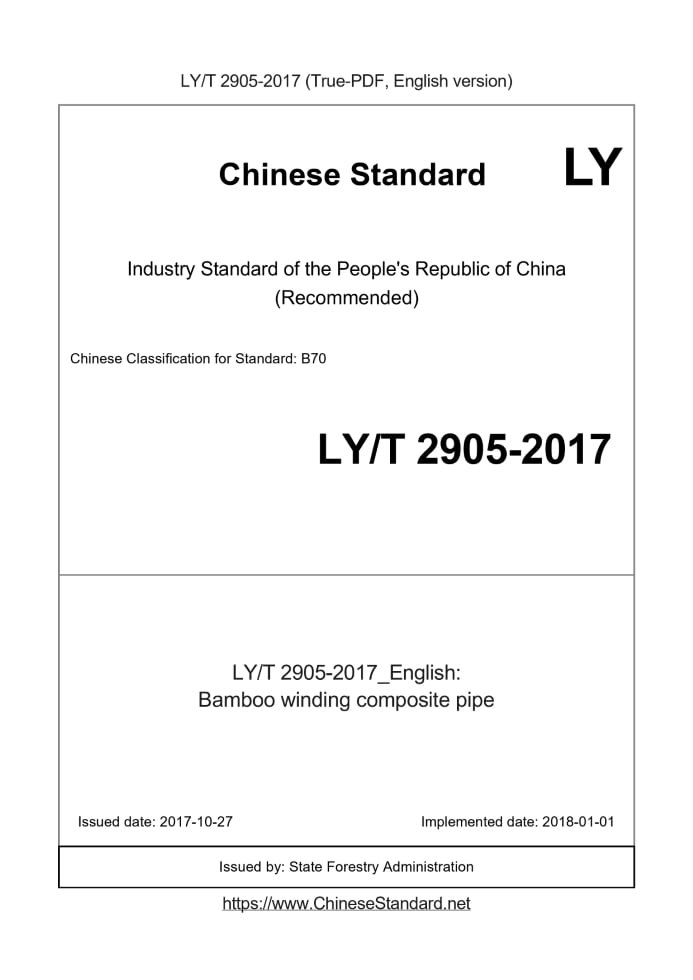Delivery: <= 5 days. True-PDF full-copy in English will be manually translated and delivered via email. LY/T 2905-2017: Bamboo winding composite pipe Status: Valid