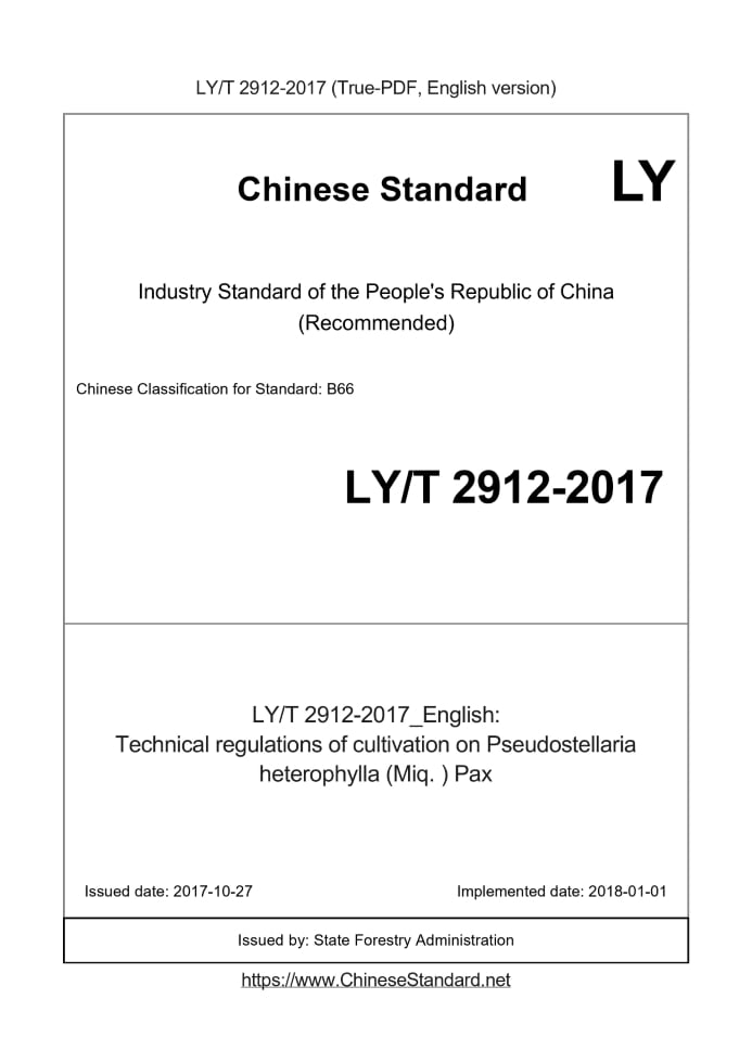 Delivery: <= 3 days. True-PDF full-copy in English will be manually translated and delivered via email. LY/T 2912-2017: Technical regulations of cultivation on Pseudostellaria heterophylla (Miq. ) Pax Status: Valid