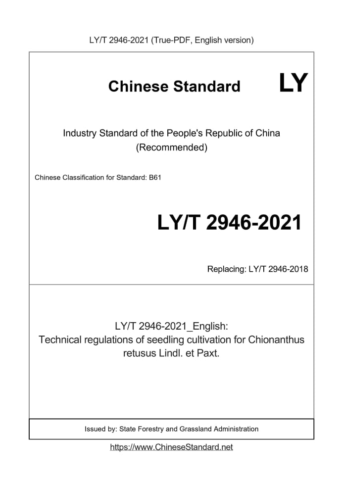 Delivery: <= 3 days. True-PDF full-copy in English will be manually translated and delivered via email. LY/T 2946-2021: Technical regulations of seedling cultivation for Chionanthus retusus Lindl. et Paxt. Status: Valid LY/T 2946: Historical versions