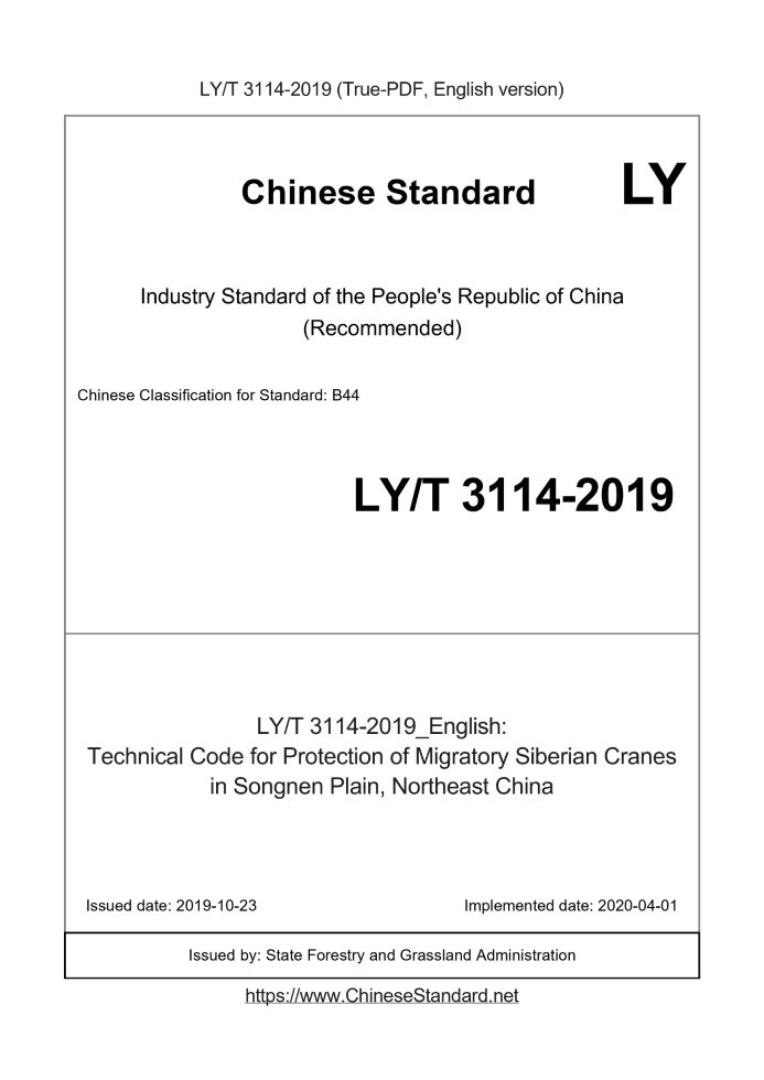 Delivery: <= 4 days. True-PDF full-copy in English will be manually translated and delivered via email. LY/T 3114-2019: Technical Code for Protection of Migratory Siberian Cranes in Songnen Plain, Northeast China Status: Valid