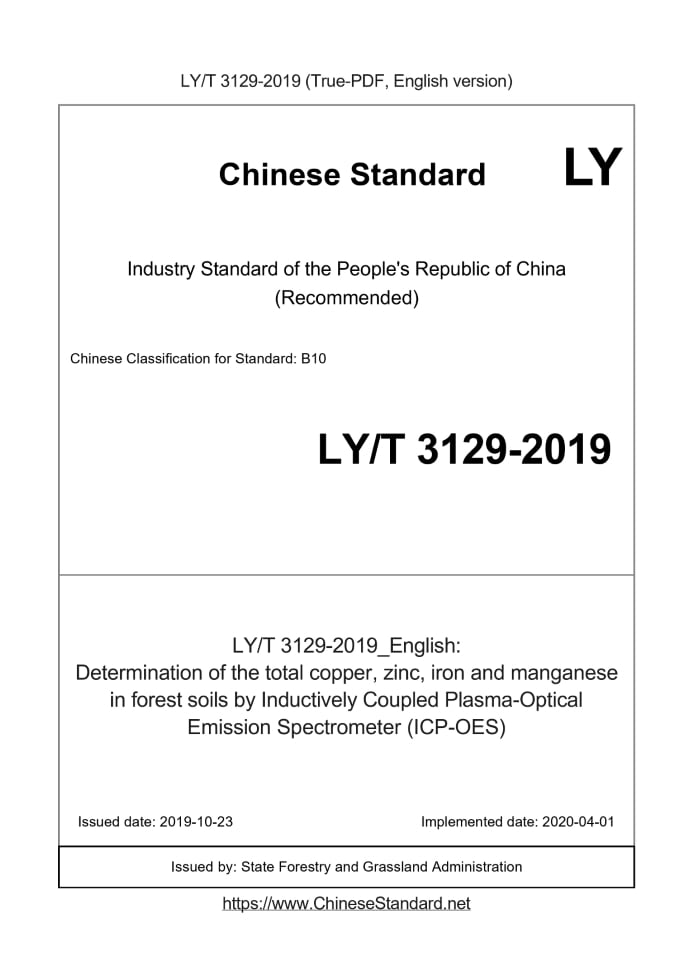 Delivery: <= 3 days. True-PDF full-copy in English will be manually translated and delivered via email. LY/T 3129-2019: Determination of the total copper, zinc, iron and manganese in forest soils by Inductively Coupled Plasma-Optical Emission Spectrometer (ICP-OES) Status: Valid