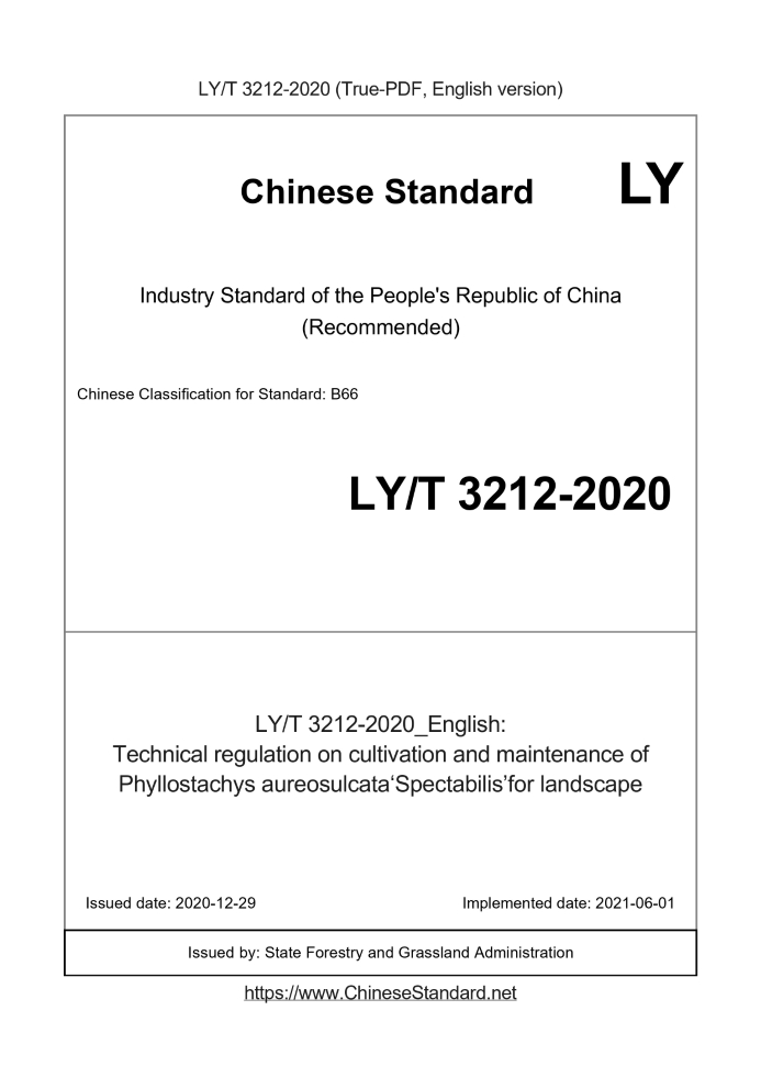 Delivery: <= 3 days. True-PDF full-copy in English will be manually translated and delivered via email. LY/T 3212-2020: Technical regulation on cultivation and maintenance of Phyllostachys aureosulcata‘Spectabilis’for landscape Status: Valid