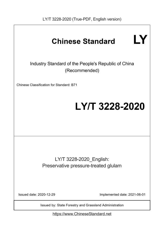 Delivery: <= 3 days. True-PDF full-copy in English will be manually translated and delivered via email. LY/T 3228-2020: Preservative pressure-treated glulam Status: Valid