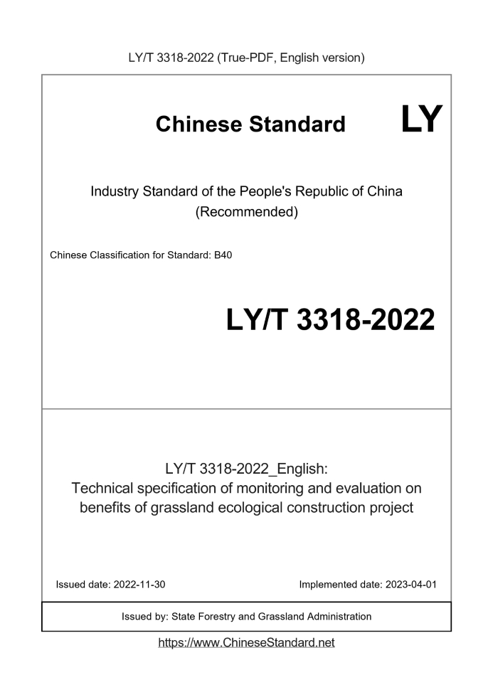 Delivery: <= 4 days. True-PDF full-copy in English will be manually translated and delivered via email. LY/T 3318-2022: Technical specification of monitoring and evaluation on benefits of grassland ecological construction project Status: Valid
