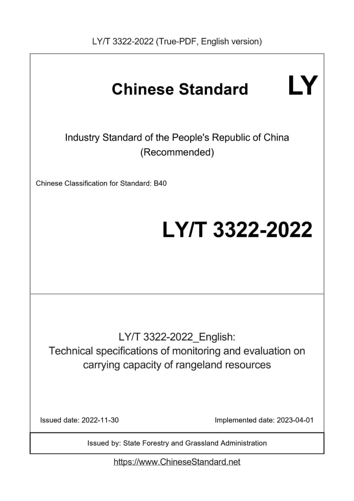 Delivery: <= 3 days. True-PDF full-copy in English will be manually translated and delivered via email. LY/T 3322-2022: Technical specifications of monitoring and evaluation on carrying capacity of rangeland resources Status: Valid