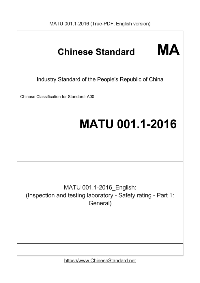 Delivery: <= 5 days. True-PDF full-copy in English will be manually translated and delivered via email. MATU001.1-2016: (Inspection and testing laboratory - Safety rating - Part 1: General) Status: Valid