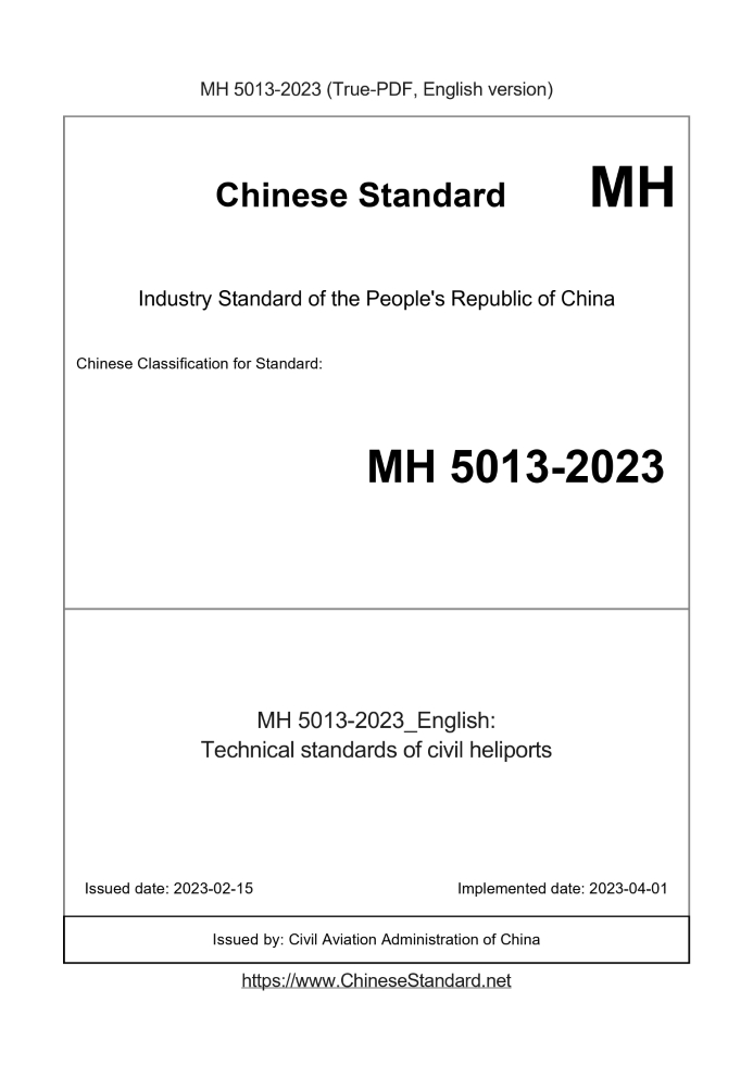 Delivery: <= 10 days. True-PDF full-copy in English will be manually translated and delivered via email. MH5013-2023: Technical standards of civil heliports Status: Valid