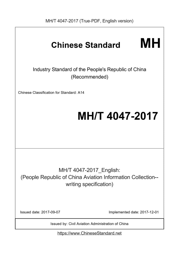 Delivery: <= 8 days. True-PDF full-copy in English will be manually translated and delivered via email. MHT4047-2017: (People Republic of China Aviation Information Collection--writing specification) Status: Valid