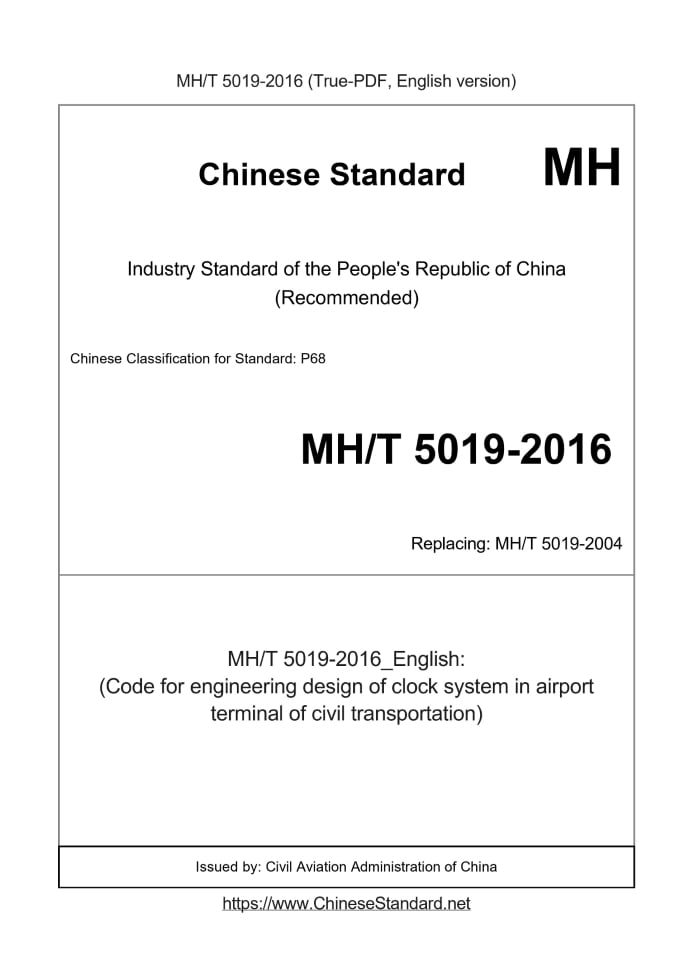 Delivery: <= 4 days. True-PDF full-copy in English will be manually translated and delivered via email. MHT5019-2016: (Code for engineering design of clock system in airport terminal of civil transportation) Status: Valid