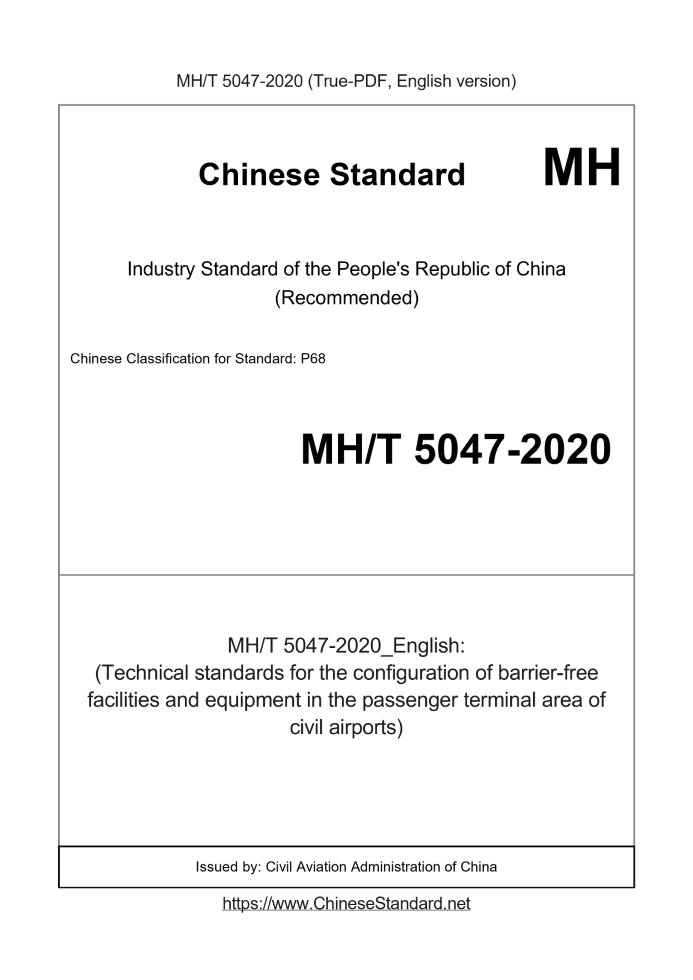 Delivery: <= 5 days. True-PDF full-copy in English will be manually translated and delivered via email. MHT5047-2020: (Technical standards for the configuration of barrier-free facilities and equipment in the passenger terminal area of civil airports) Status: Valid