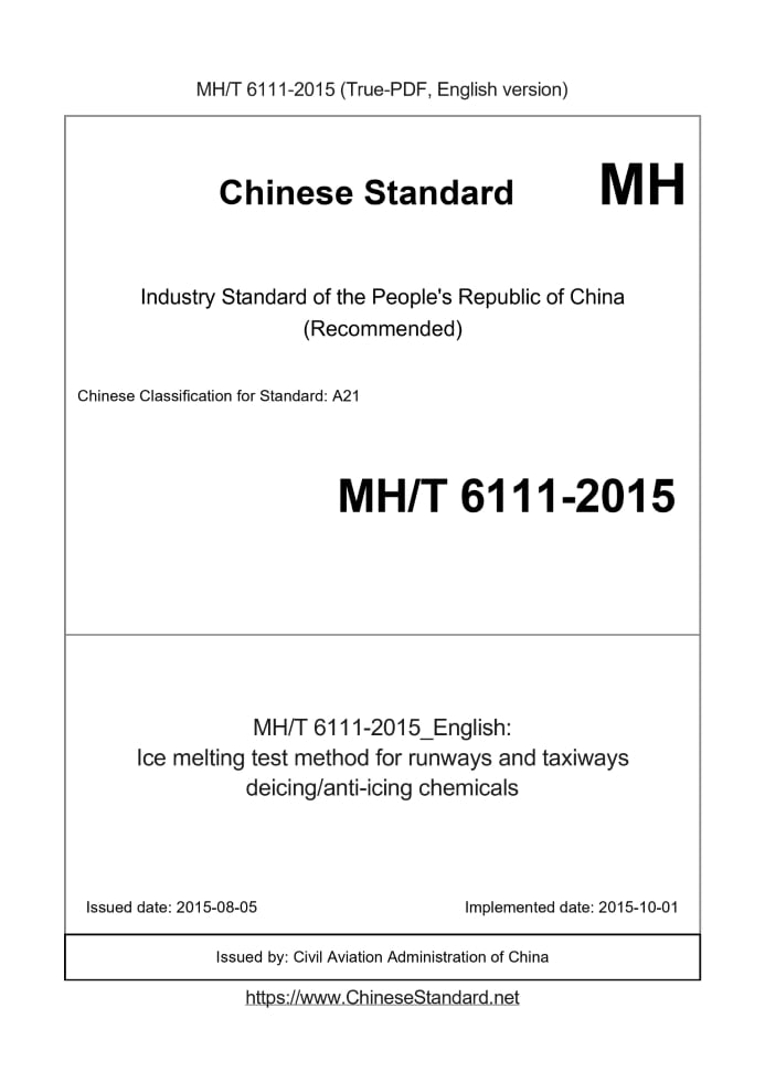Delivery: <= 3 days. True-PDF full-copy in English will be manually translated and delivered via email. MHT6111-2015: Ice melting test method for runways and taxiways deicing/anti-icing chemicals Status: Valid