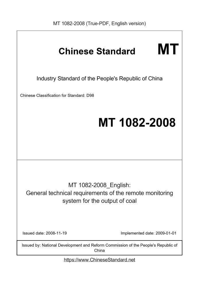 Delivery: <= 4 days. True-PDF full-copy in English will be manually translated and delivered via email. MT 1082-2008: General technical requirements of the remote monitoring system for the output of coal