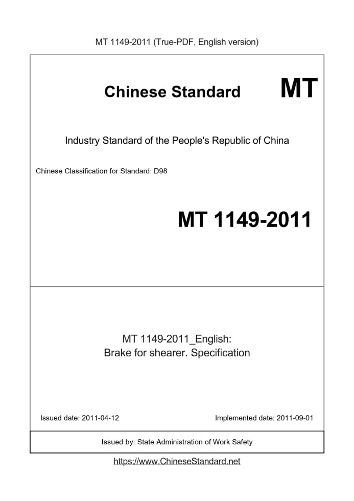 Delivery: <= 3 days. True-PDF full-copy in English will be manually translated and delivered via email. MT 1149-2011: Brake for shearer. Specification Status: Valid