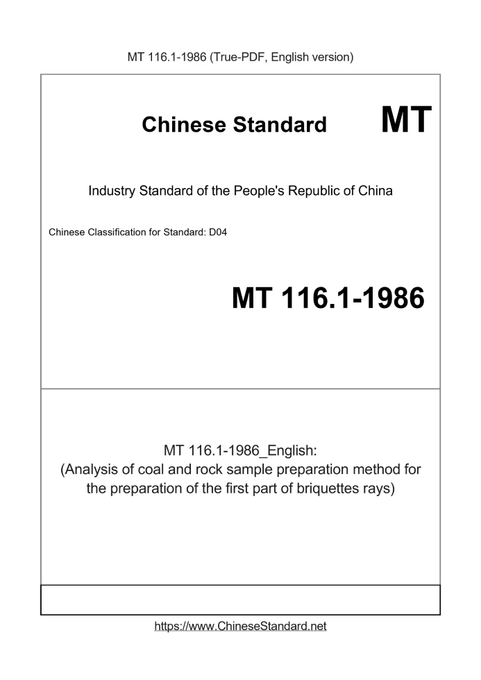Delivery: <= 2 days. True-PDF full-copy in English will be manually translated and delivered via email. MT 116.1-1986: (Analysis of coal and rock sample preparation method for the preparation of the first part of briquettes rays) Status: Obsolete