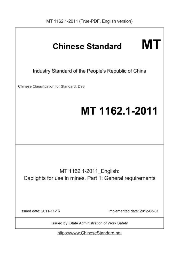 Delivery: <= 3 days. True-PDF full-copy in English will be manually translated and delivered via email. MT 1162.1-2011: Caplights for use in mines. Part 1: General requirements Status: Valid