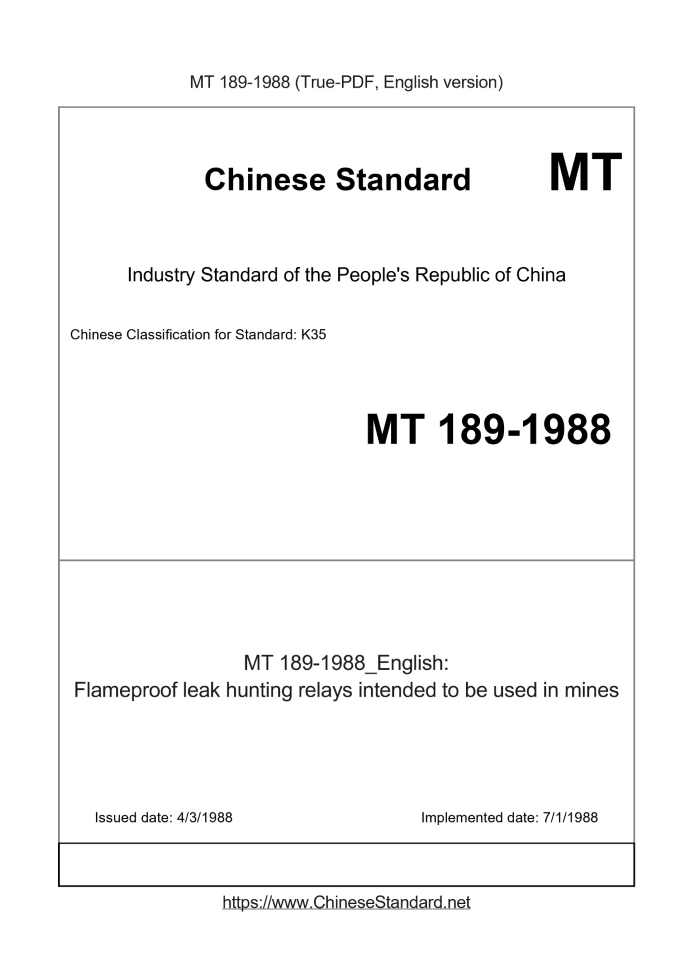 Delivery: <= 3 days. True-PDF full-copy in English will be manually translated and delivered via email. MT 189-1988: Flameproof leak hunting relays intended to be used in mines Status: Obsolete