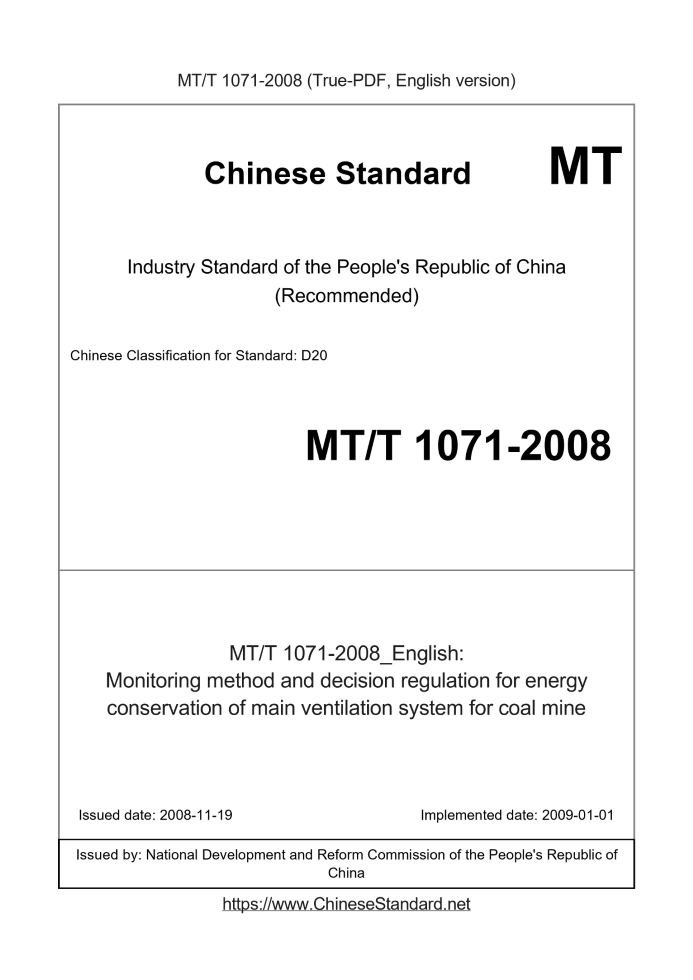Delivery: <= 3 days. True-PDF full-copy in English will be manually translated and delivered via email. MT/T 1071-2008: Monitoring method and decision regulation for energy conservation of main ventilation system for coal mine Status: Valid