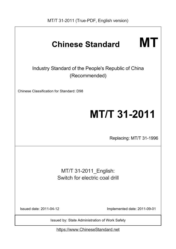 Delivery: <= 3 days. True-PDF full-copy in English will be manually translated and delivered via email. MT/T 31-2011: Switch for electric coal drill Status: Valid MT/T 31: Historical versions