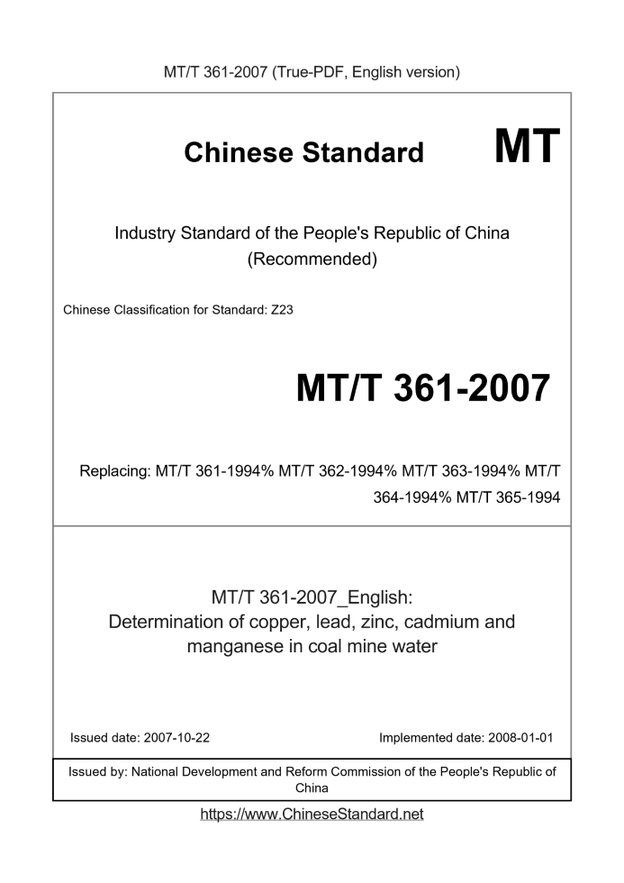 Delivery: <= 3 days. True-PDF full-copy in English will be manually translated and delivered via email. MT/T 361-2007: Determination of copper, lead, zinc, cadmium and manganese in coal mine water Status: Valid MT/T 361: Historical versions