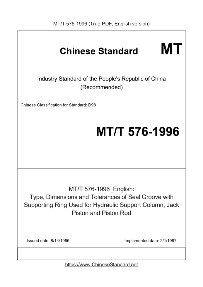 Delivery: <= 3 days. True-PDF full-copy in English will be manually translated and delivered via email. MT/T 576-1996: Type, Dimensions and Tolerances of Seal Groove with Supporting Ring Used for Hydraulic Support Column, Jack Piston and Piston Rod Status: Obsolete