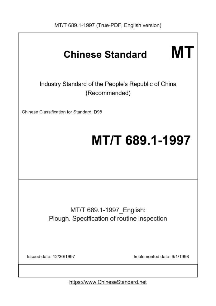 Delivery: <= 3 days. True-PDF full-copy in English will be manually translated and delivered via email. MT/T 689.1-1997: Plough. Specification of routine inspection Status: Obsolete