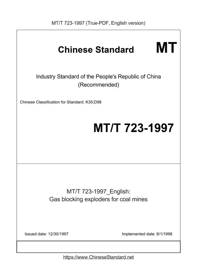 Delivery: <= 3 days. True-PDF full-copy in English will be manually translated and delivered via email. MT/T 723-1997: Gas blocking exploders for coal mines