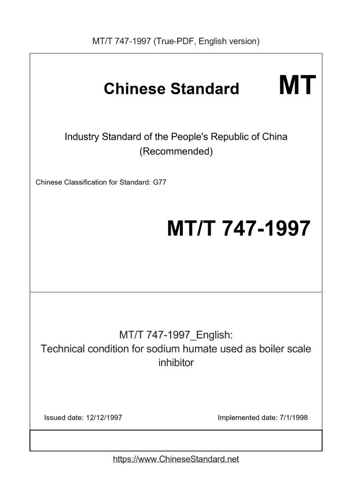 | MT/T 747-1997 English PDFUS$249.00 · In stock Delivery: <= 3 days. True-PDF full-copy in English will be manually translated and delivered via email. MT/T 747-1997: Technical condition for sodium humate used as boiler scale inhibitor