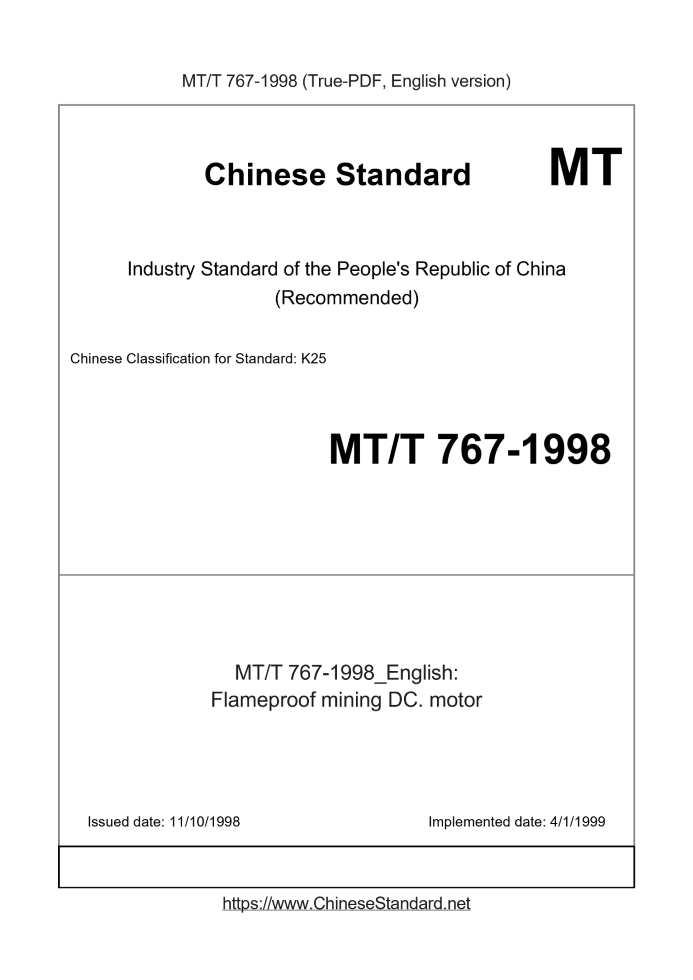 | MT/T 767-1998 English PDFUS$639.00 · In stock Delivery: <= 5 days. True-PDF full-copy in English will be manually translated and delivered via email. MT/T 767-1998: Flameproof mining DC. motor Status: Obsolete